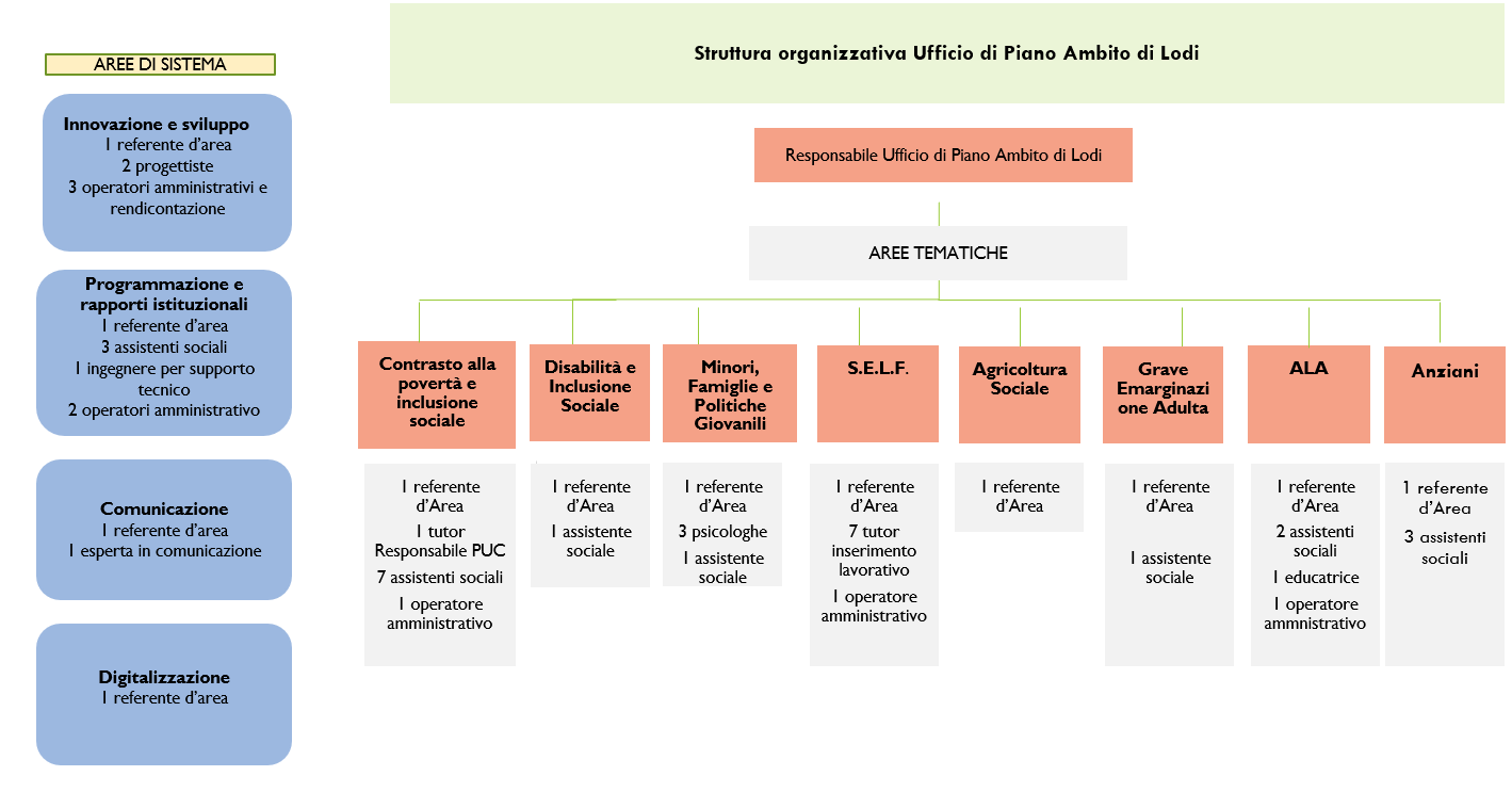 Di seguito è possibile visualizzare l'organigramma dell'Ufficio di Piano dell'Ambito di Lodi alla data del 28 febbraio 2026